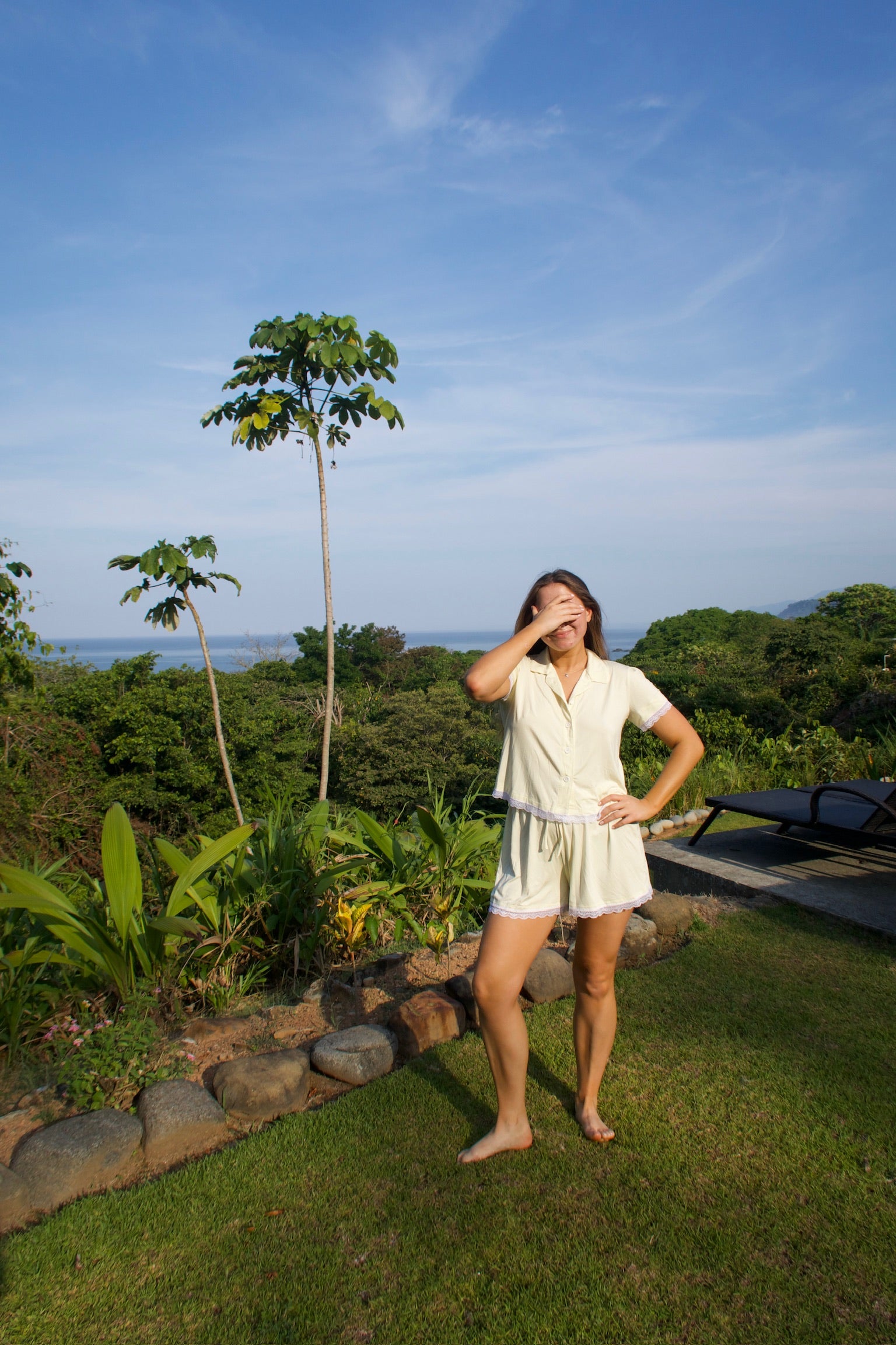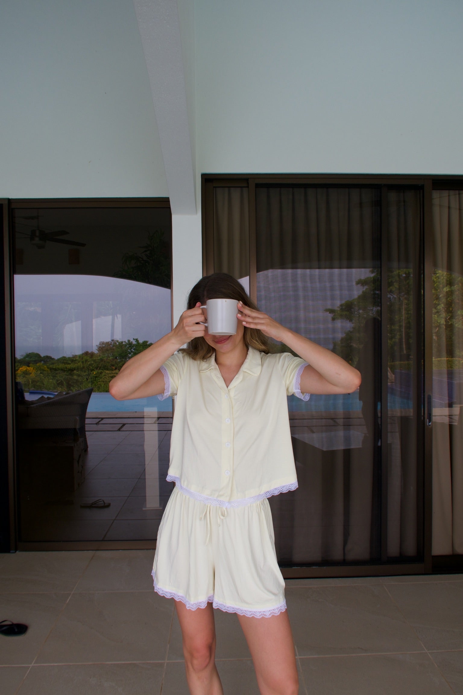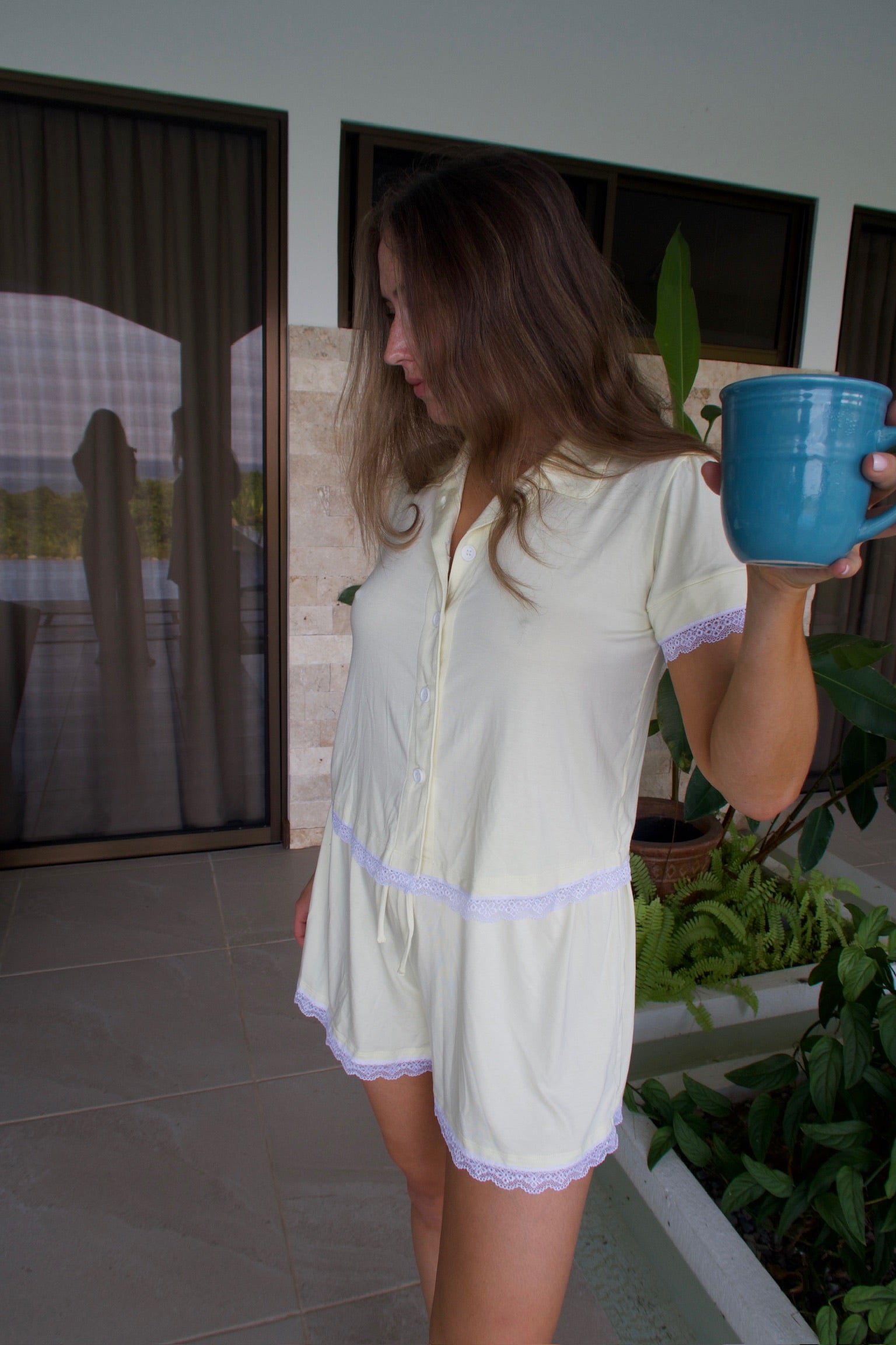 Meet Celeste. Our all new, short sleeve pajama shirt in an ultra soft and breathable modal fabric. Celeste takes note from the Lyra with its cropped style & a slightly gathered shoulder. Our Butter Yellow colorway features a dainty lace trim.